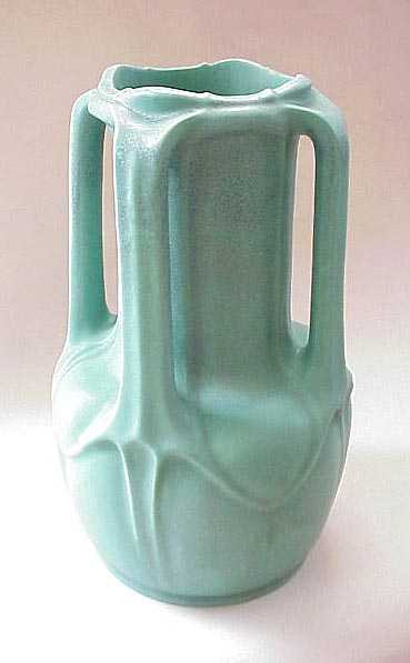 Big important 4-handled vase, 14½" tall x 8½" maximum diameter, very nice glaze. Small professionally restored chip on the inside rim and another one on the foot rim. It's possible that there is another small one on the foot. The vase is otherwise in mint condition with no hairline cracks or gross restoration. Signed Teco twice and the number "223". (#21299)