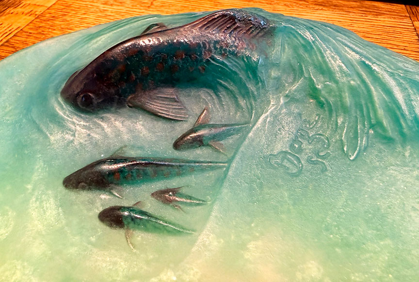 This delightful tray has a school of beautiful fish on a seafoam green background. 6" in diameter. Signed A. WALTER NANCY and the artist Bergé. Mint condition.