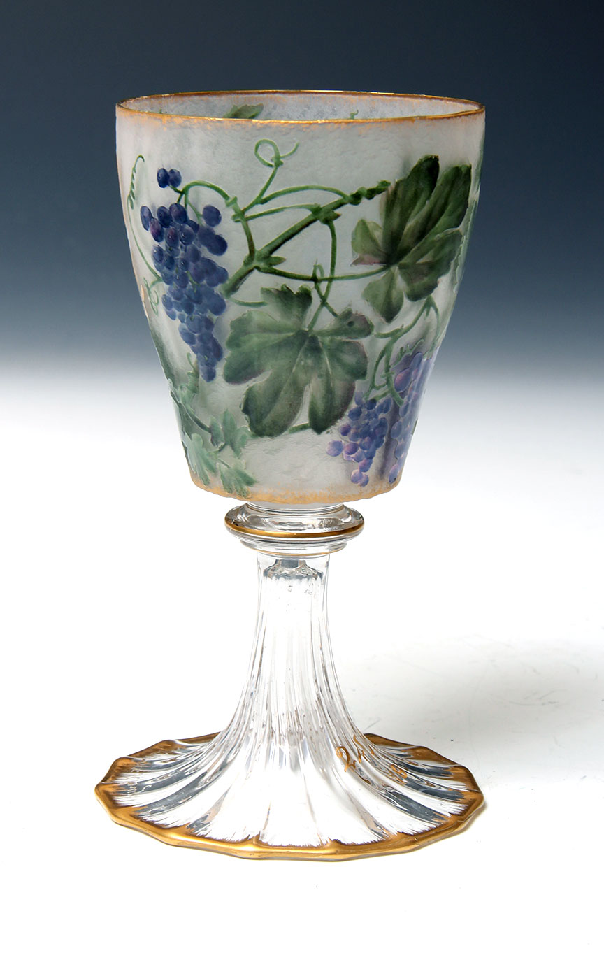 The exceptional workmanship is acid-etched, enameled and gilded. The condition is superb. It's signed Daum Nancy, together with the Cross of Lorraine. 6" tall.