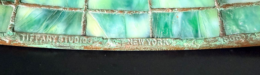 The lamp is in wonderful original condition, with no restoration to the shade and close to zero hairline cracks. It is signed TIFFANY STUDIOS NEW YORK 1555. The patina on the shade and the base is rich, with shades of green, red and brown.