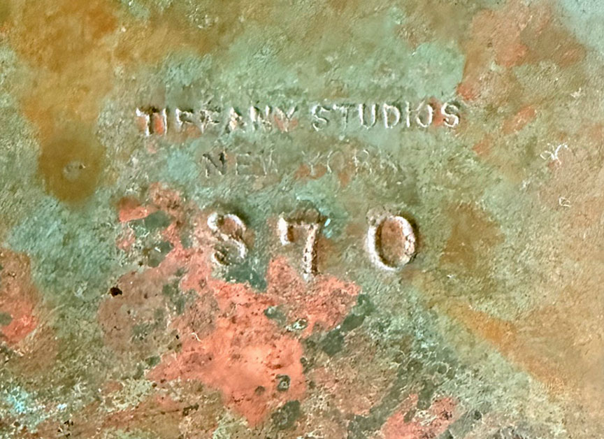 The base is a ribbed library base, with three original electrical sockets. It is signed underneath, TIFFANY STUDIOS NEW YORK 370.