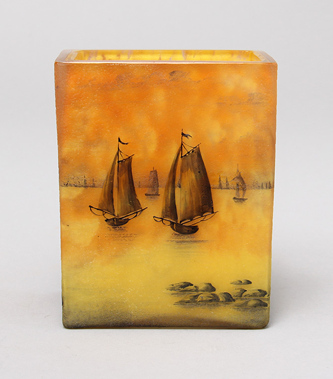Daum Nancy didn't produce many marine vases. This example is particularly nice because of the multitude of boats and the rare rectangular shape. Very good color and detail. 5" tall. Signed. Mint condition.