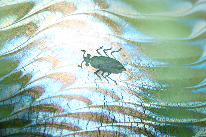 What a cool Tiffany Favrile lamp this is! The shade is mint, signed, gorgeous, and has a carved insect! The base is one of the best and rarest I've ever had for a Favrile glass shade, with a fantastic original patina. The base is adjustable, so the shade can be raised (but why you would want to do that, I have no idea). 23½" tall. Fully signed and mint condition.