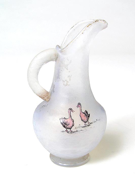 This is a delightful ewer with acid-etched and enameled decoration of a little Alsatian girl tending to her geese. Wonderful little piece! Signed. Mint condition.